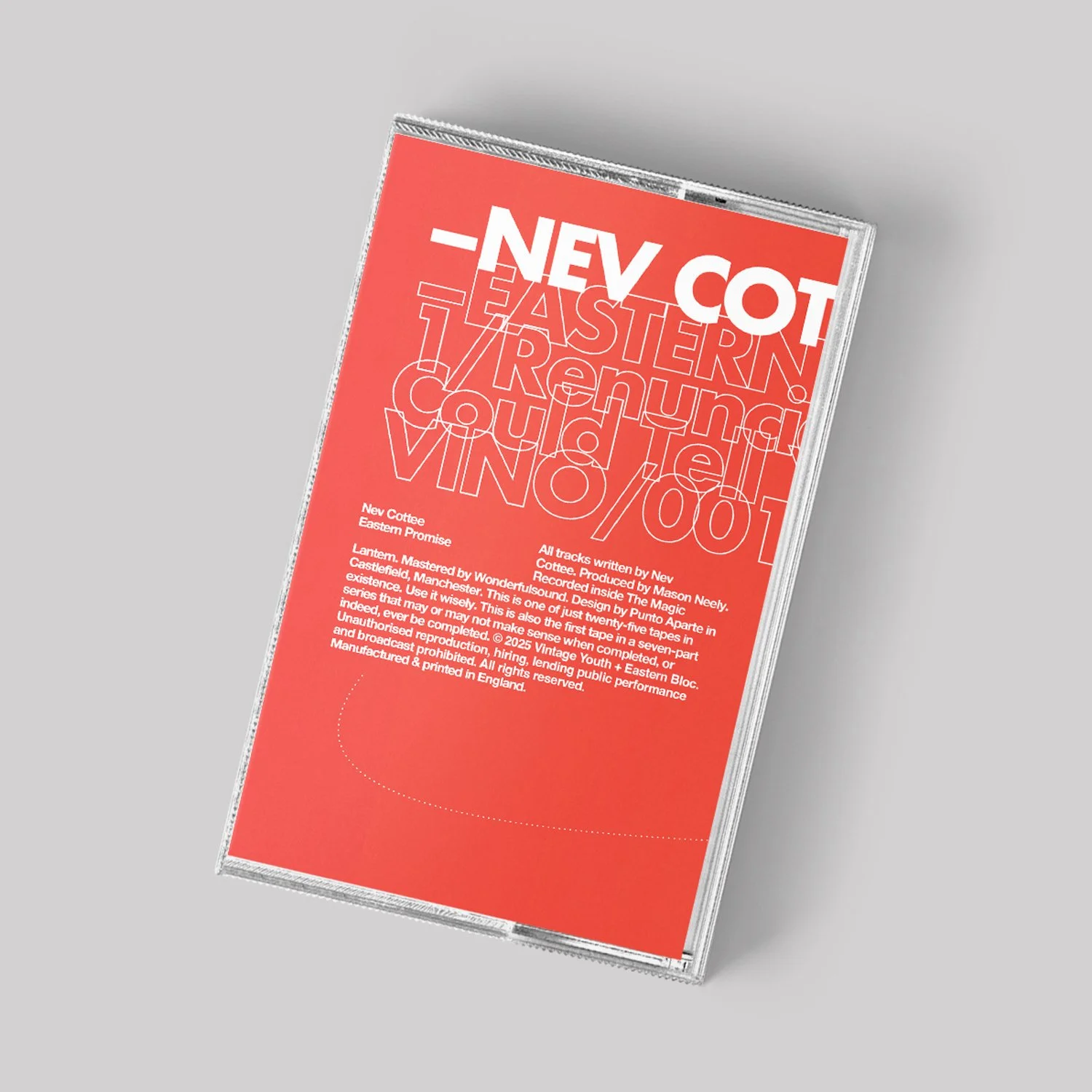 The first in a seven-part cassette series, Eastern Promise is a brand-new 4-track EP from Manchester singer-songwriter Nev Cottee — known for his deep, cinematic songwriting and unmistakable voice. Released in collaboration between Vintage Youth × Eastern Bloc, this tape is limited to just 25 copies. Across four richly atmospheric tracks, Cottee, a regular at the shop blends timeless songwriting with the mood and texture of late-night travels, captured in warm analogue hiss. Recorded to high-grade cassette and housed in bespoke artwork, Eastern Promise marks the launch of a rare collector’s series. Once these 25 are gone, they’re gone — and the series moves forward. Only available here or instore at Eastern Bloc.